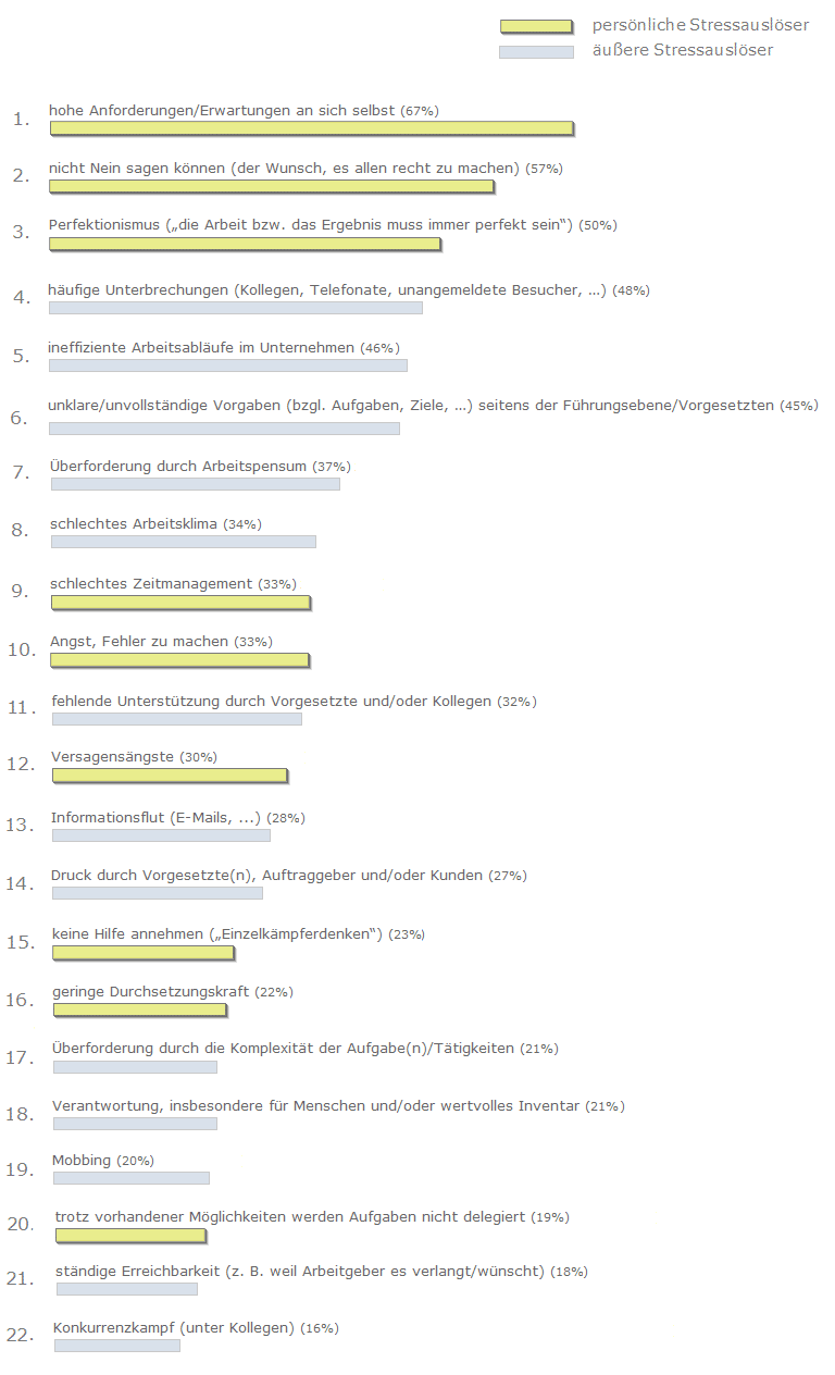 Die Umfrage zeigt, dass ein hohes Arbeitspensum erst an 7. Stelle in der Reihung der größten Stressursachen steht, wenn man die äußeren und persönlichen Stressauslöser gemeinsam betrachtet.